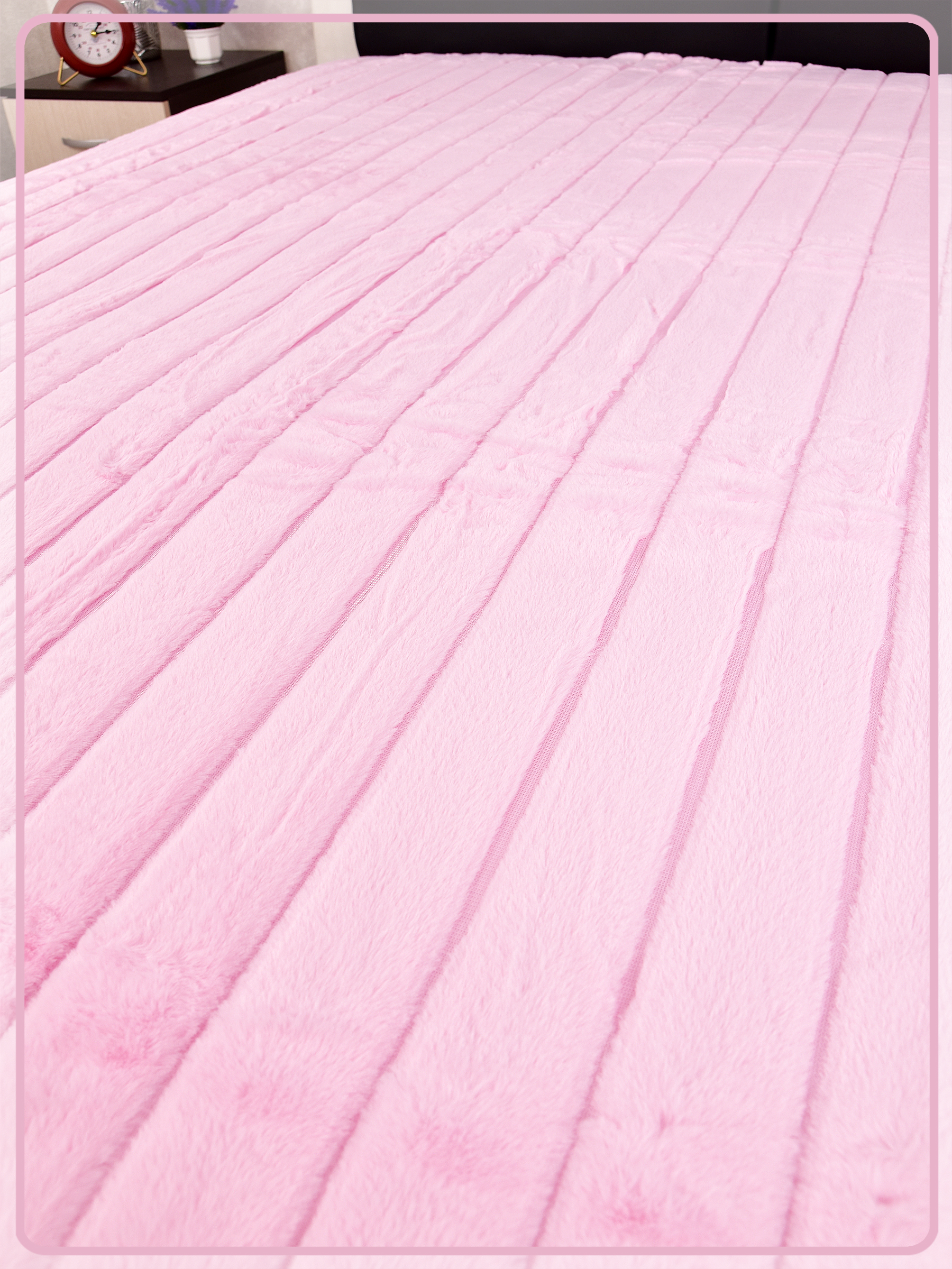 Мягкий, пушистый, большой, яркий, искусственный плед "Кролик" с одной стороны имеет длинный пушистый ворс, похожий на настоящий мех, а обратная его сторона - это нежный плюш. Можно использовать две стороны, тем самым менять интерьер комнаты. Плед не только без труда украсит интерьер, но и защитит мебель от повреждений и загрязнений.
